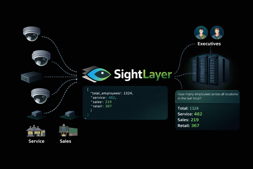 For example, a CEO or operations lead can ask how many people are currently present across all locations. SightLayer can respond with a single total number, derived from live edge reports, without referencing any images or identities. The same query can be broken down by functional zones, such as service bays, sales floors, or retail areas, providing an immediate operational snapshot.